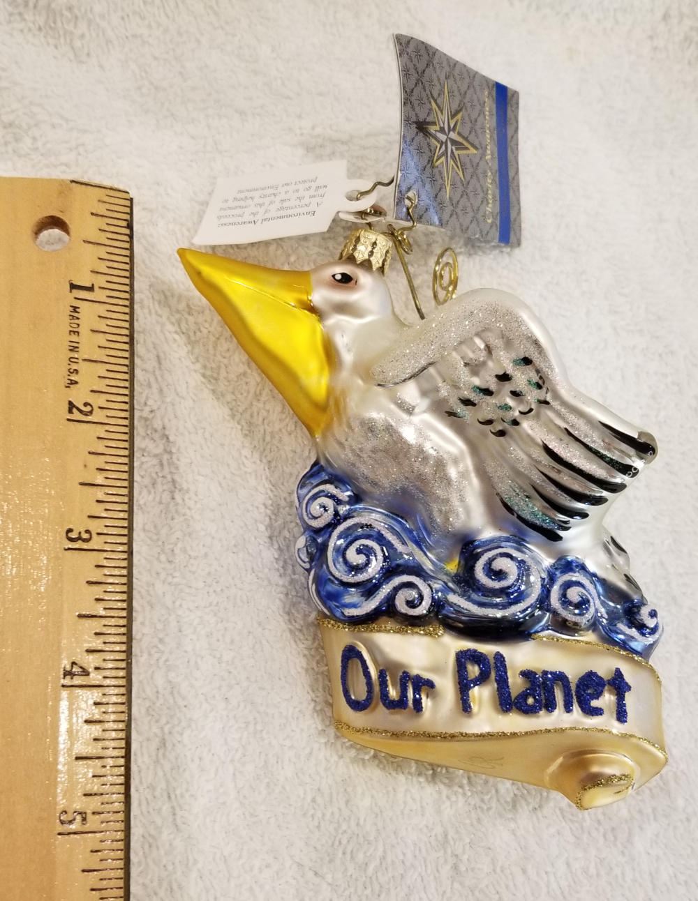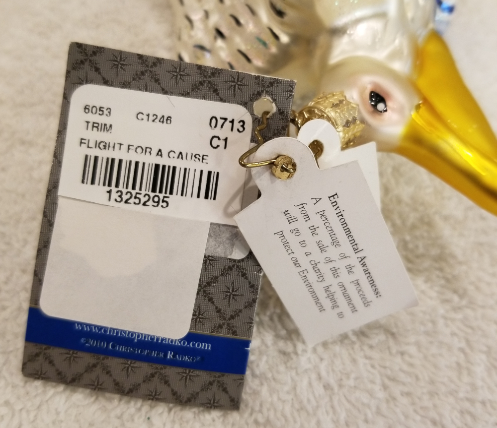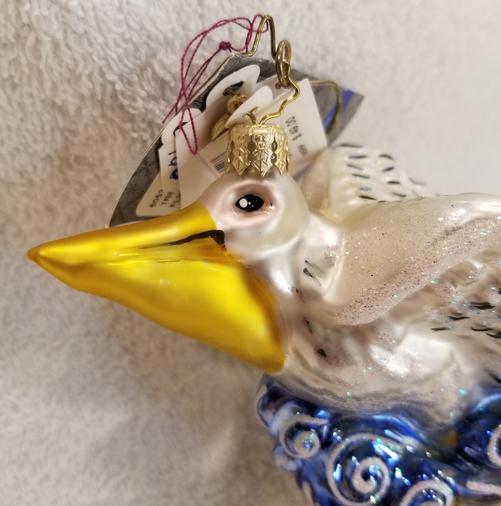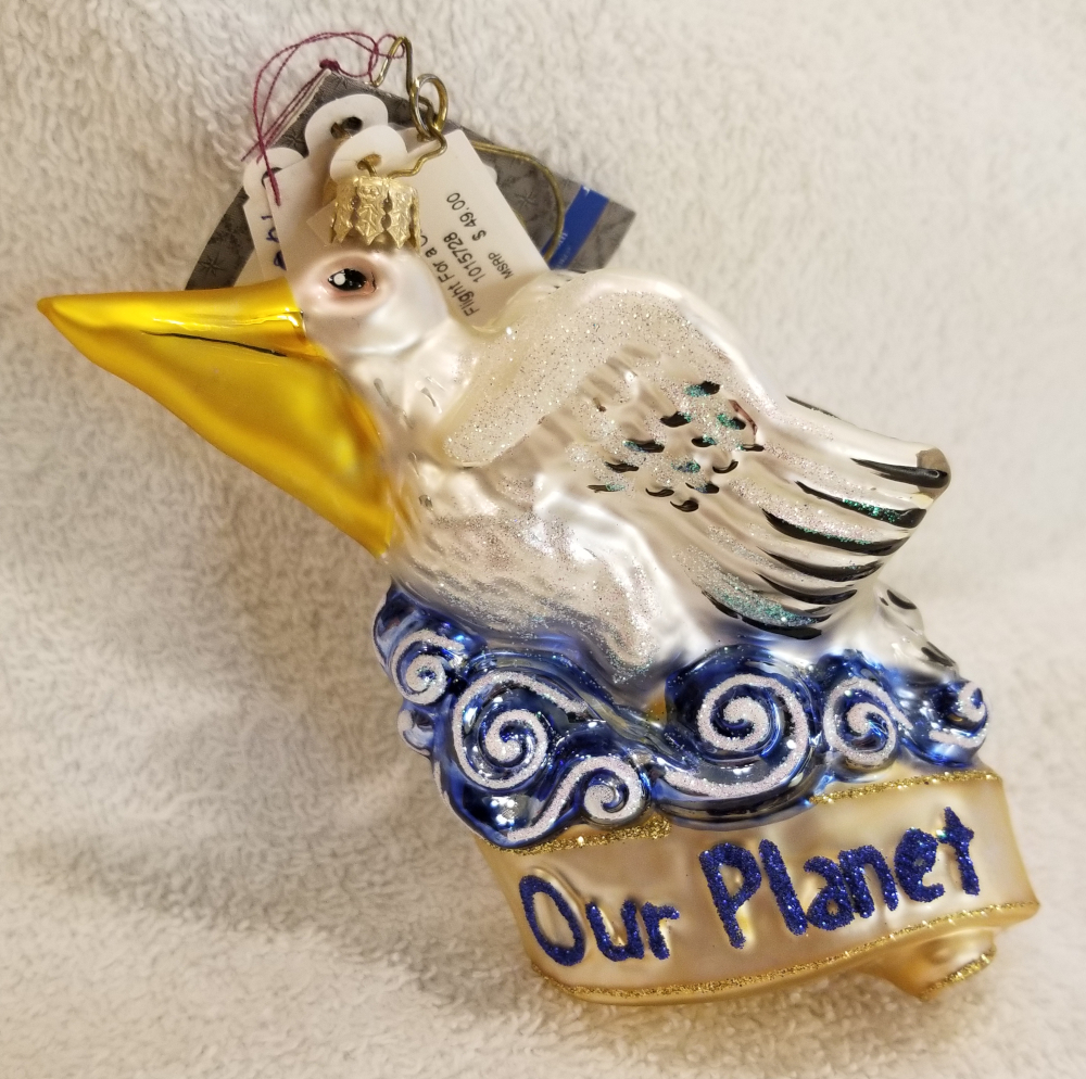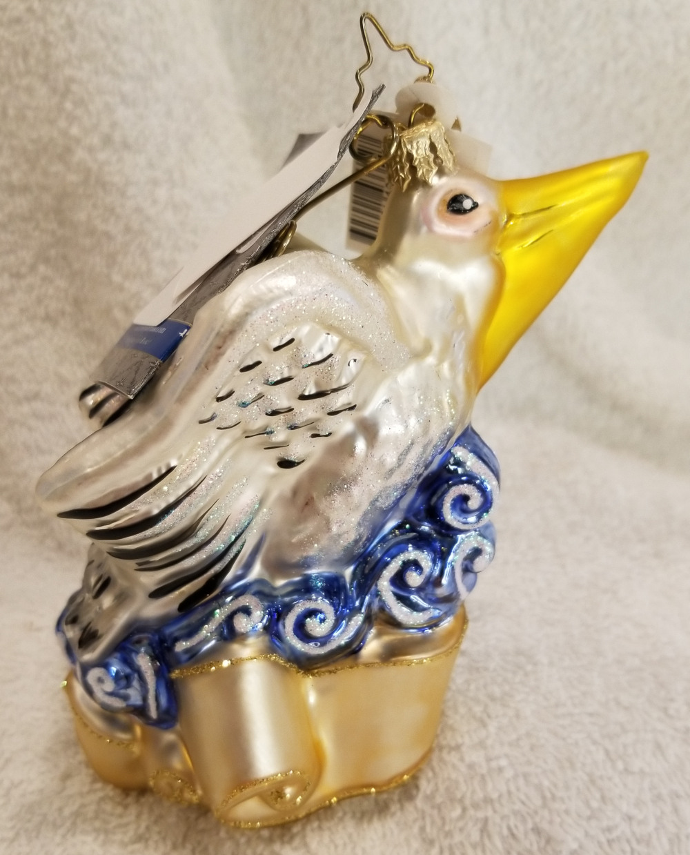 | Today I'm listing Flight for a Cause. From 2011, this is part of Christopher Radko's Environmental Awareness initiative. It is number 1015728. This ornament features a pelican flying over the ocean. All of the tags are still attached. I'm asking the original purchase price of $50 plus shipping via Pirate Ship. |