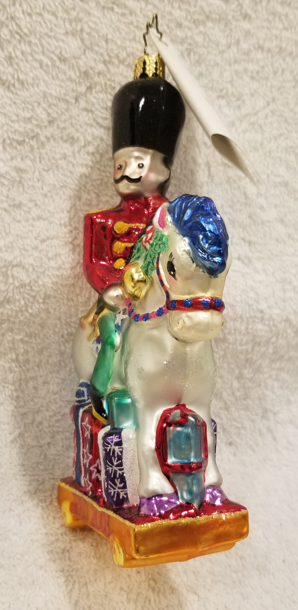 | I'm listing another FAO Schwarz exclusive. This is Toy Soldier, Radko number 3010484. From 2003, this is a soldier riding his trusty horse getting ready to deliver all the beautiful gifts at his feet. The cart is labeled with FAO 2003. The original metal charm and paper tag are included. I'm asking $35 plus shipping via Pirate Ship. |