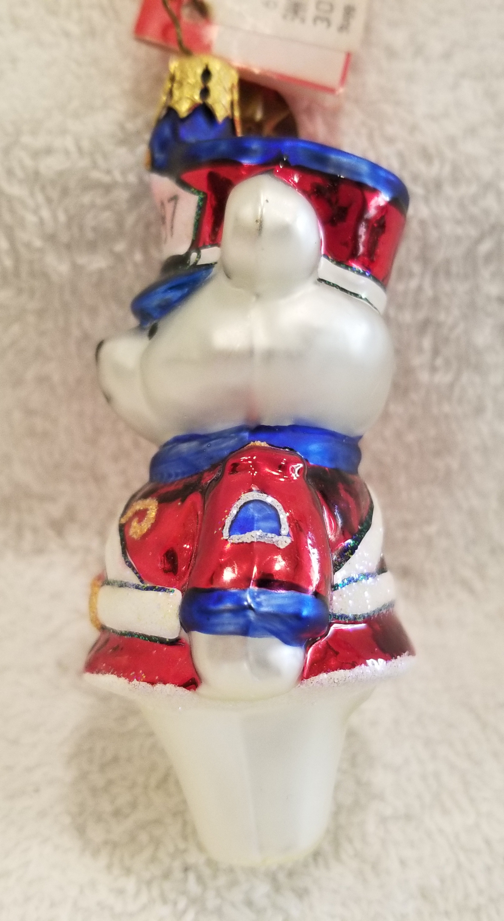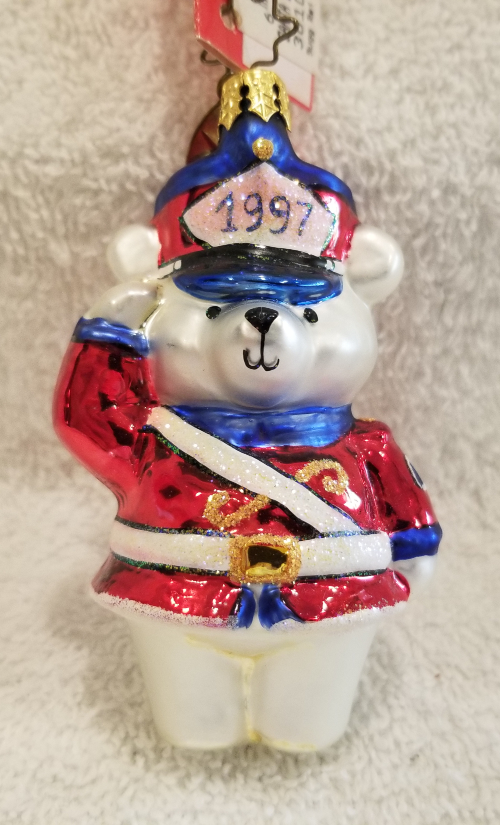 | Today I'm listing another cute bear Marshall Fields Exclusive gem. This is Radko number 3010697, 1997 Santa Bear Gem. This is a white polar bear dressed as a soldier with the year 1997 on his cover. The original metal charm and paper tag are included. I'm asking the original purchase price of $30 plus shipping via Pirate Ship |