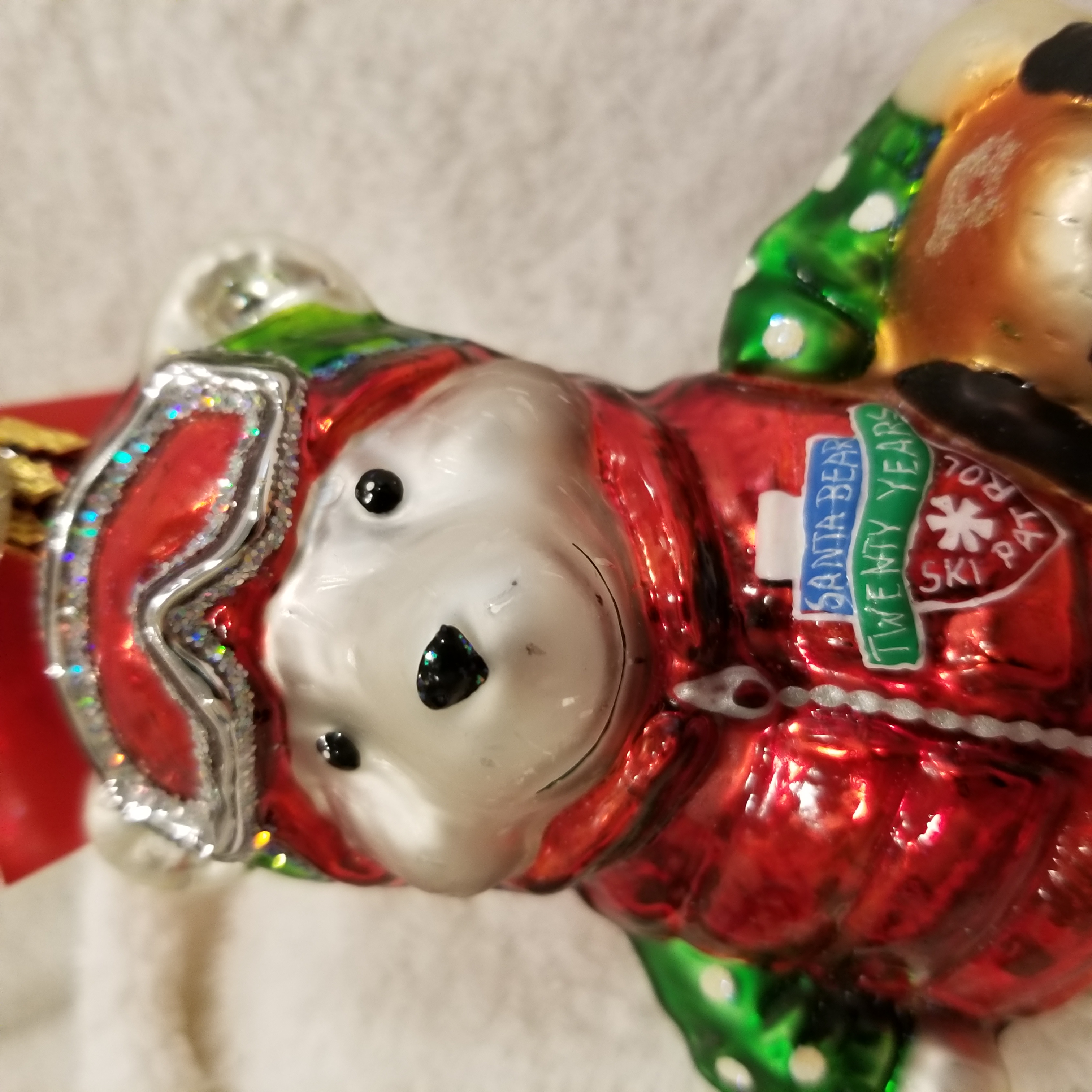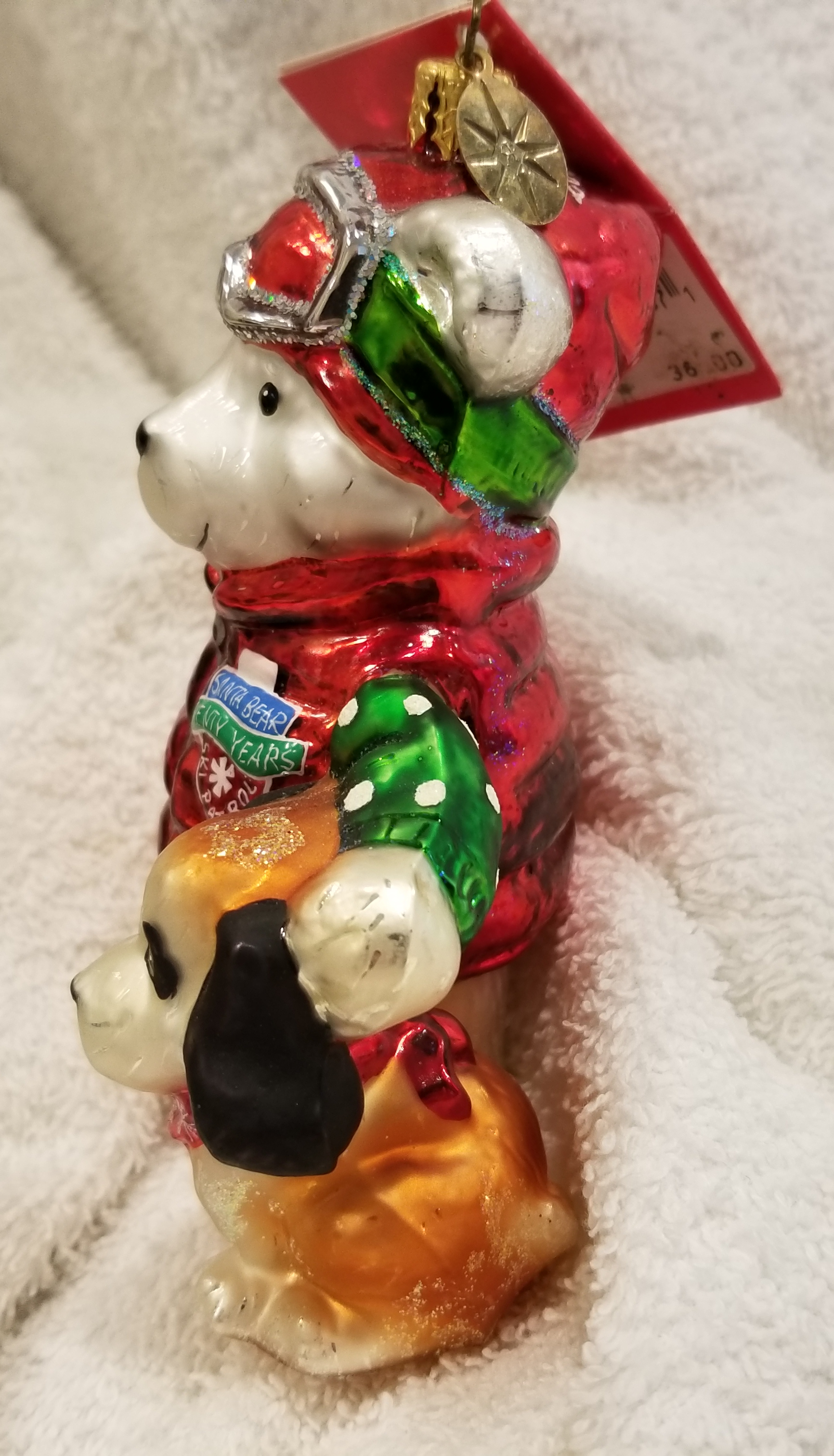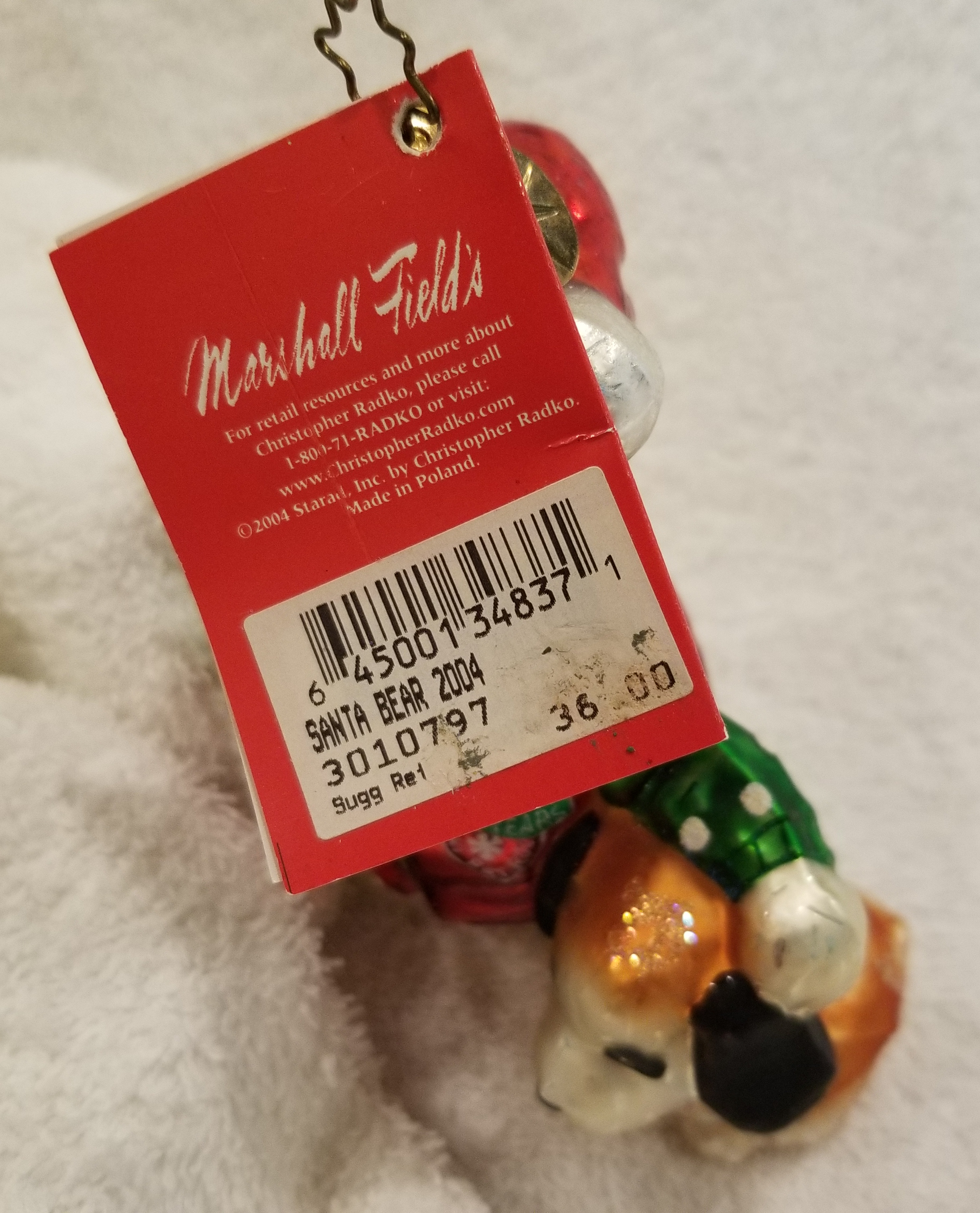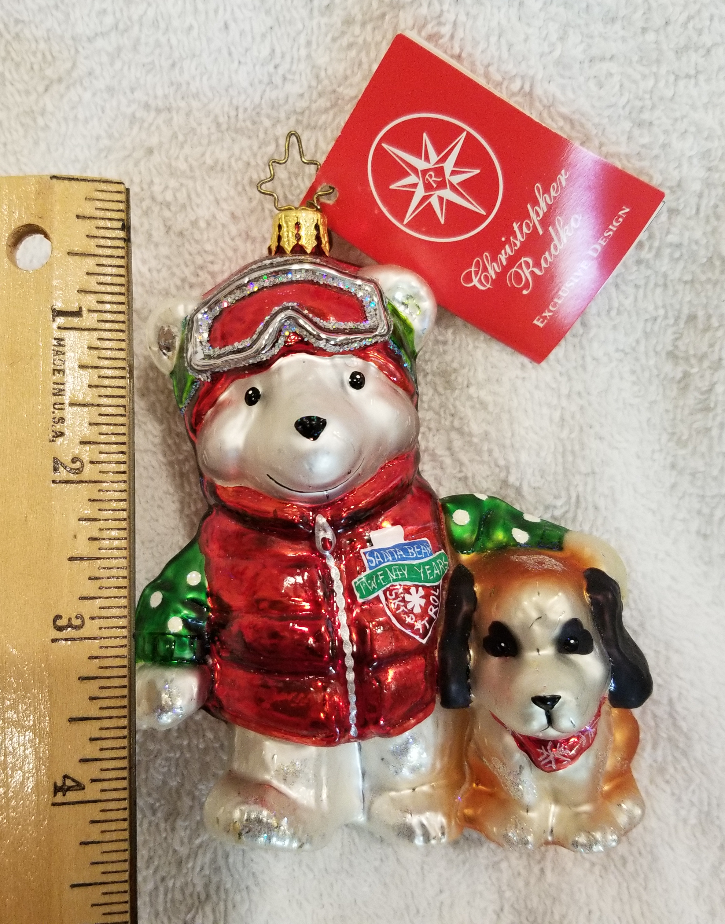| Today I'm listing another cute bear. This is 2004 Marshall Fields Santa Bear Ski Patrol with pet dog. Radko number 3010797. This is a big bear dressed in ski gear with a red parka and goggles. Next to him is his trusty pet dog. The original metal charm and the paper tag are still attached. I'm asking $40 plus shipping via Pirate Ship however you prefer. Please ask if there are any questions and thanks for taking a look! |