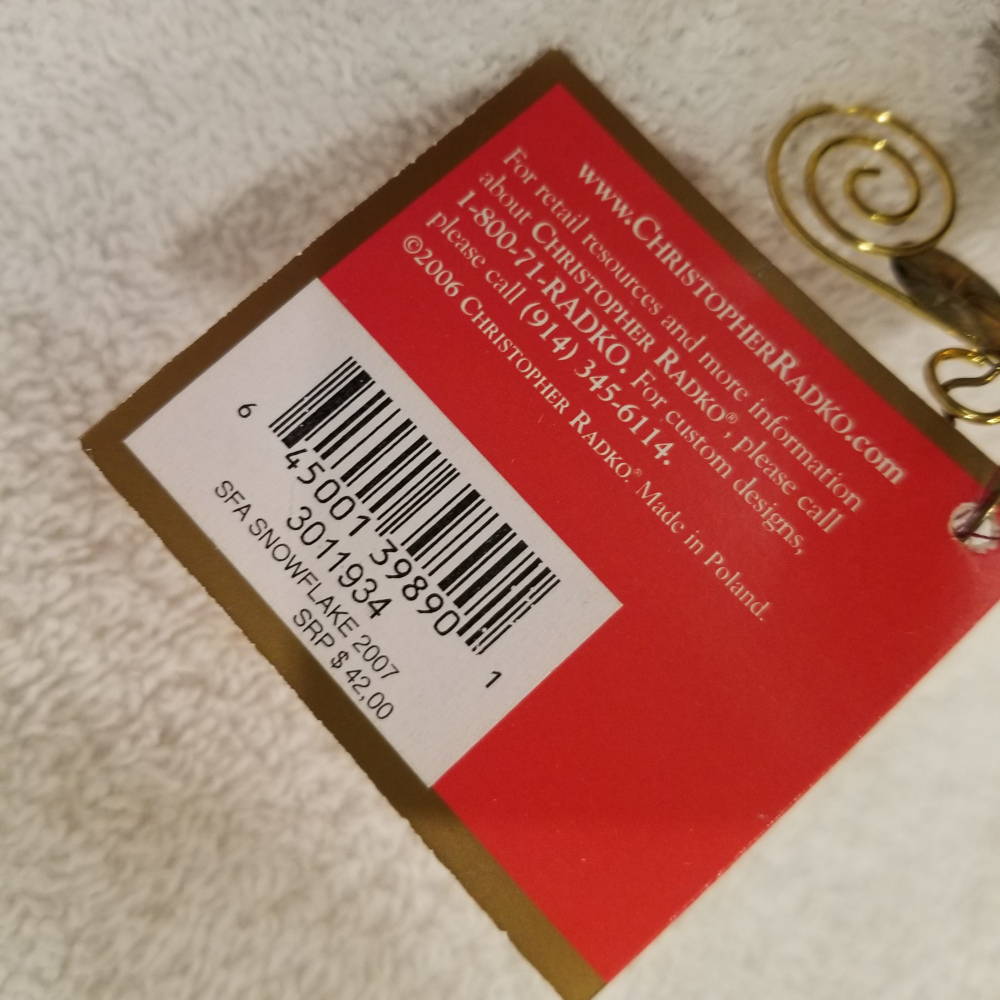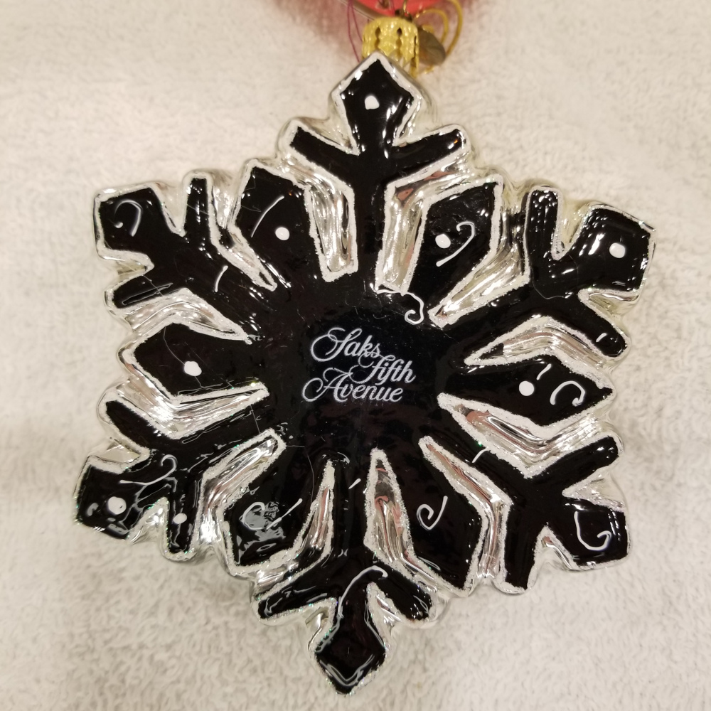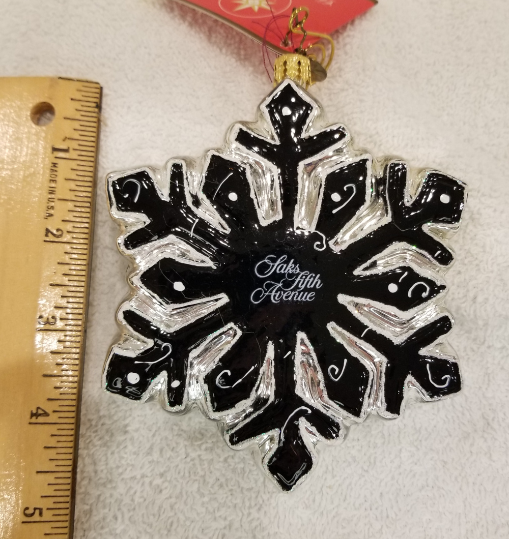 | This one is special! Today I'm offering Radko number 3011934 Saks Fifth Avenue Snow Flake. This beautiful black, white and silver ornament is approx. 4 1/2" tall. Be sure to check out the video and pictures! The original paper tag and metal tag are still attached and it comes with a Radko box. I'm asking $50 for this ornament plus shipping via pirate ship either standard or priority, however you prefer. Please ask if there are any questions and thanks for taking a look! |