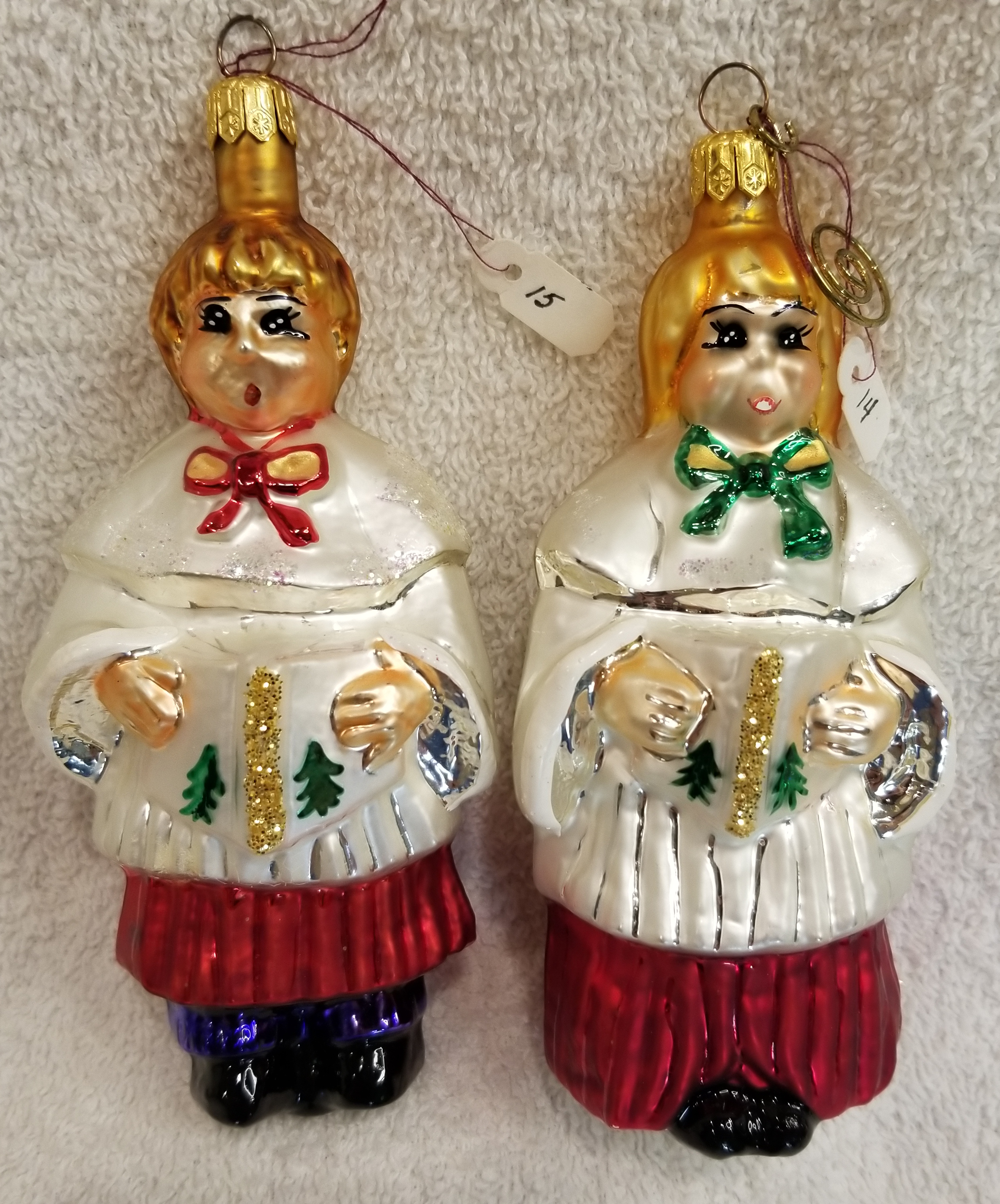 | Today I'm listing another cute pair. This is Sing Me Now, Radko number 96-176-0. I'm listing the boy and the girl together. They are both approx. 5" tall and seem like church choir members at a Christmas show. I have no idea why they are so expensive on ebay, but I'm listing the pair together at $50 plus shipping via Pirate Ship however you prefer. Please ask if there are any questions and thanks for taking a look! |