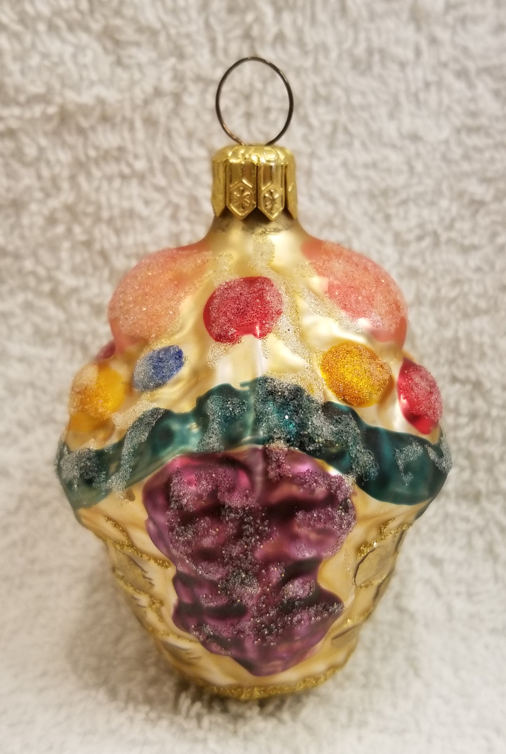 | I'm listing Harvest Home, Radko number 97-371-1. This is another fruit basket, but this one has frosted fruit and is a different style basket than the usual square style. It stands approx. 3" tall and the original paper tag is available. I'm asking only $25 plus shipping via Pirate Ship. |