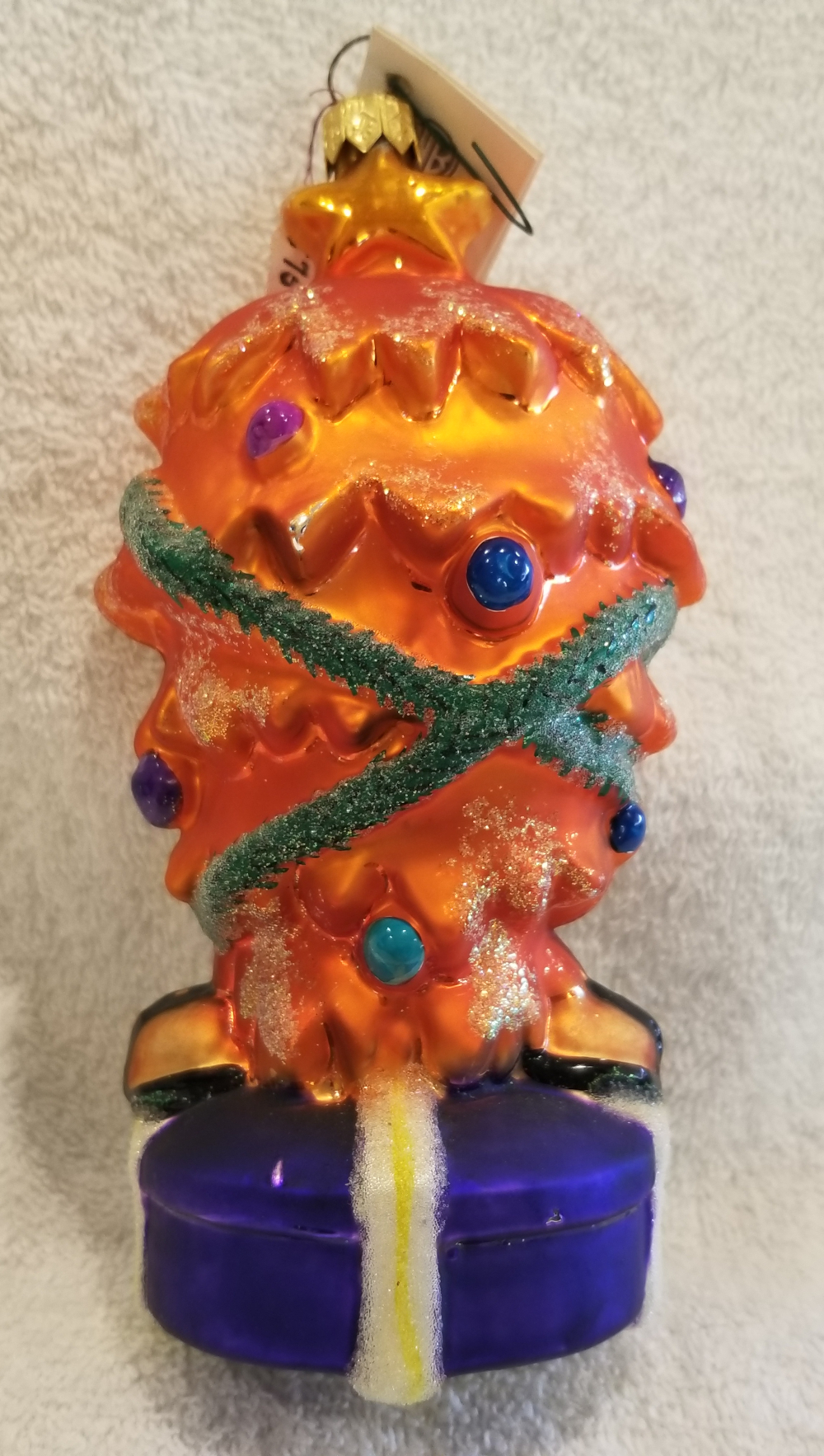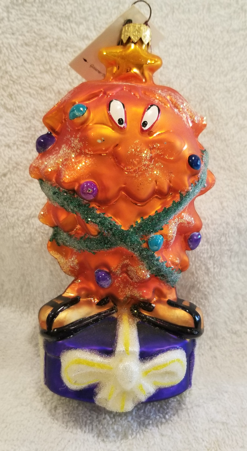 | I'm listing another Warner Brothers collaboration. This is 1997 Gossamer Tree, Radko number 97-GOS. This is Gossamer from the Bugs Bunny cartoons wrapped in green ivy and decorated with shiny Christmas balls. He is standing on a big blue hat-box style present. I'm asking $65 plus shipping via Pirate Ship. |