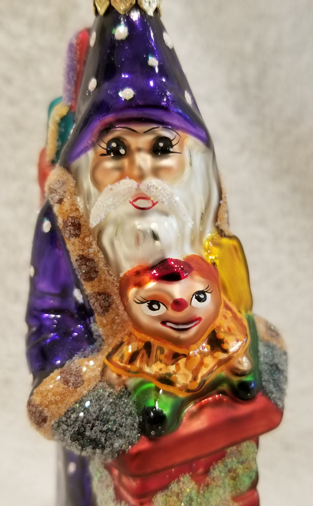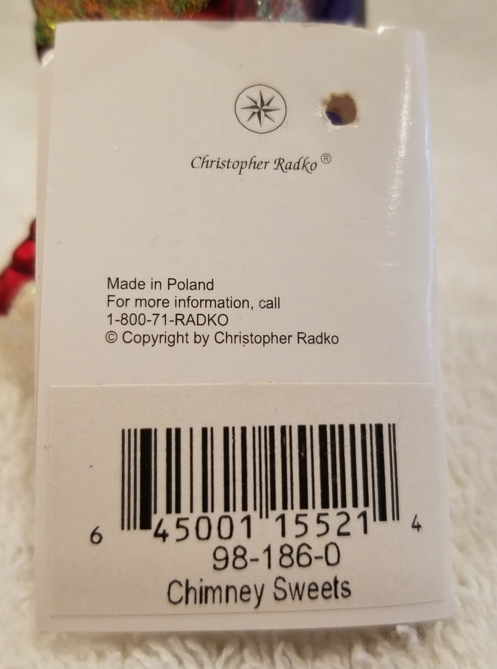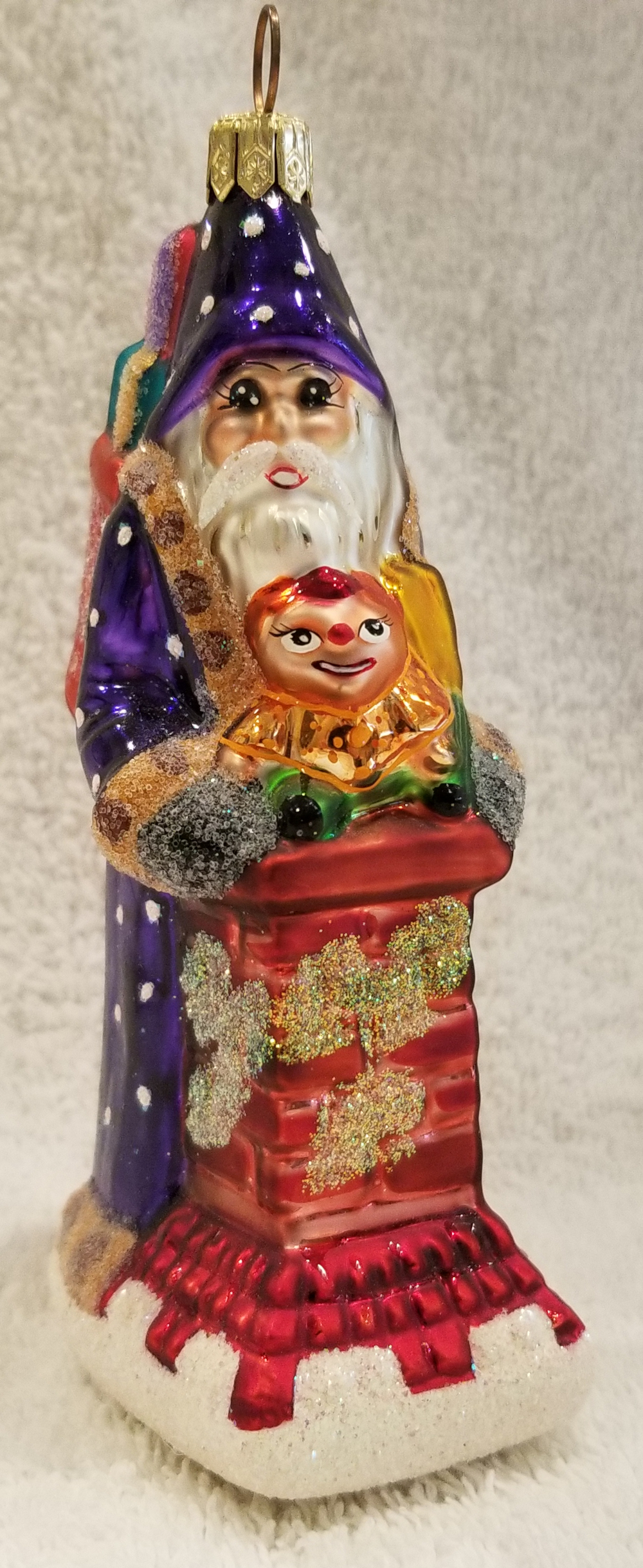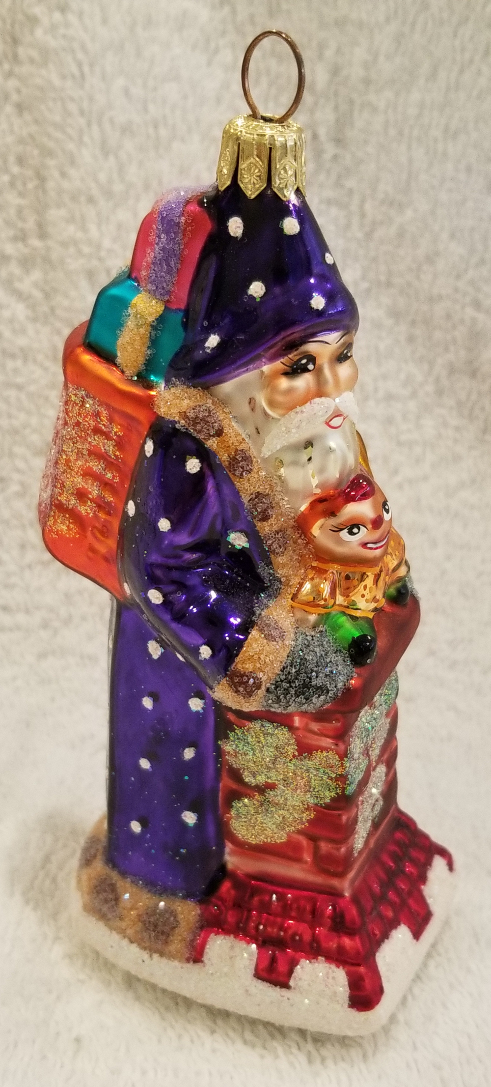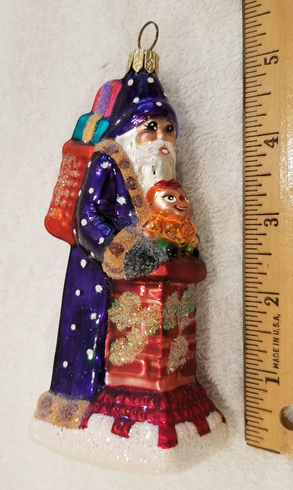 | I'm listing another cute Santa ornament. This is Chimney Sweets, Radko number 98-186-0. This is jolly Santa wearing a long purple robe, standing in front of a chimney with a doll. Santa has a pack of gifts on his back. The original paper tag is included. I'm asking $40 plus shipping via Pirate Ship. |