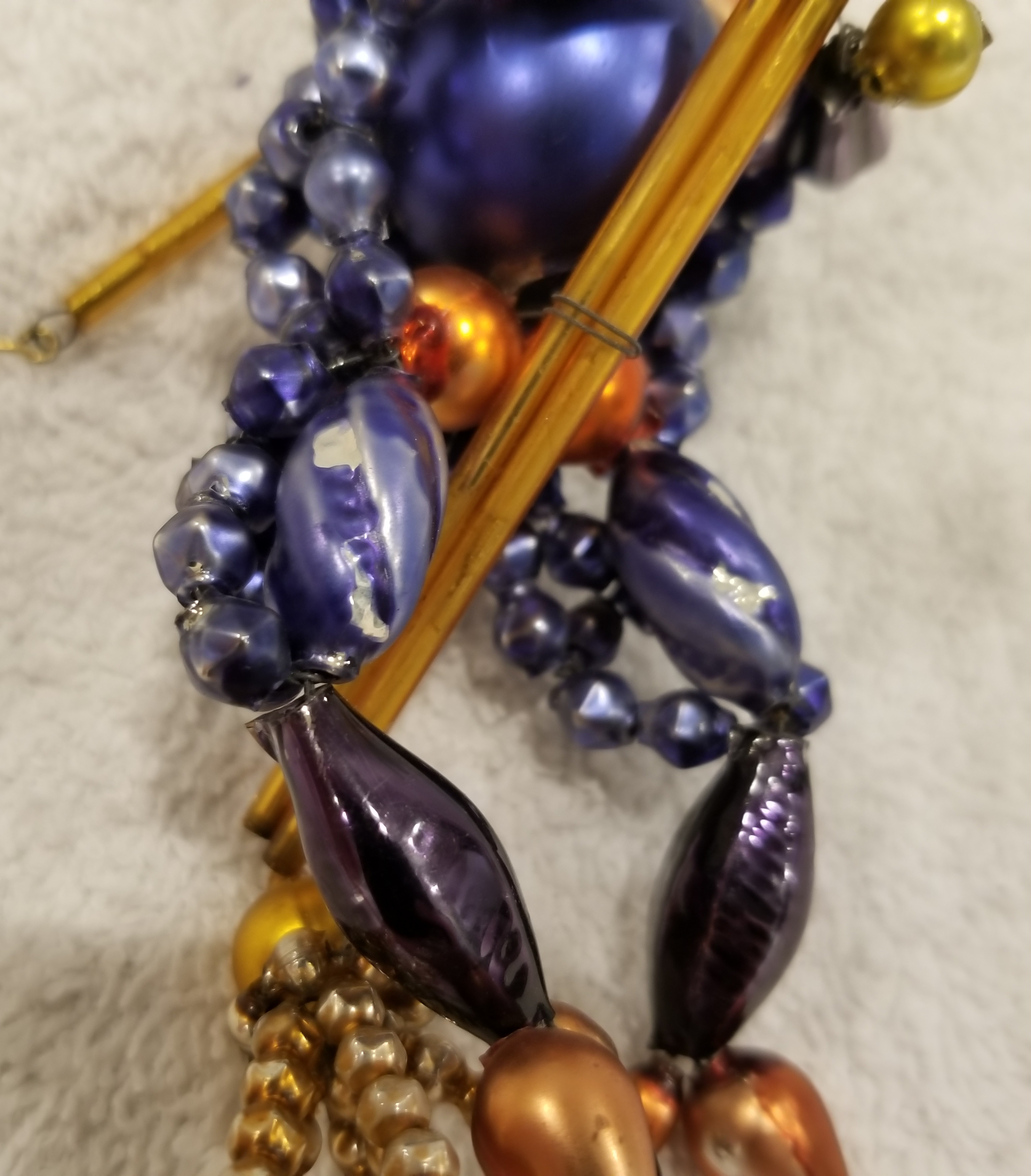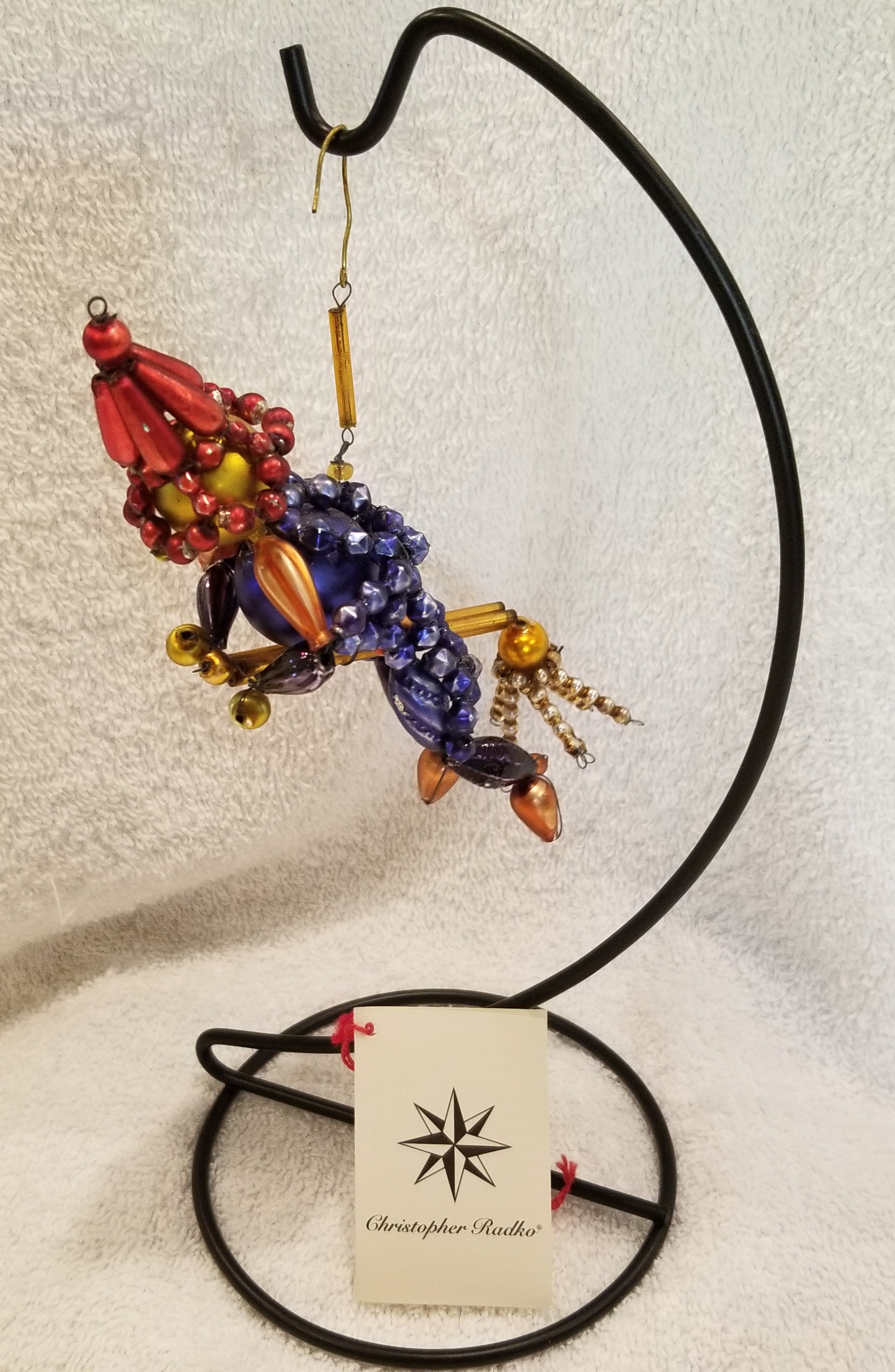 | This week I'm listing Halloween ornaments I just received! This is Broom With A View. Radko number 98-233-0. This amazing beaded ornament is a witch on a broomstick. Have a look at all the pictures! Some of the blue coating is coming off in a couple of small spots on the thighs, but otherwise the ornament is in great condition. You can see this in one of the pictures. The original paper tag is available. I'm asking $30 plus shipping via Pirate Ship however you prefer. Please ask if there are any questions and thanks for taking a look! |