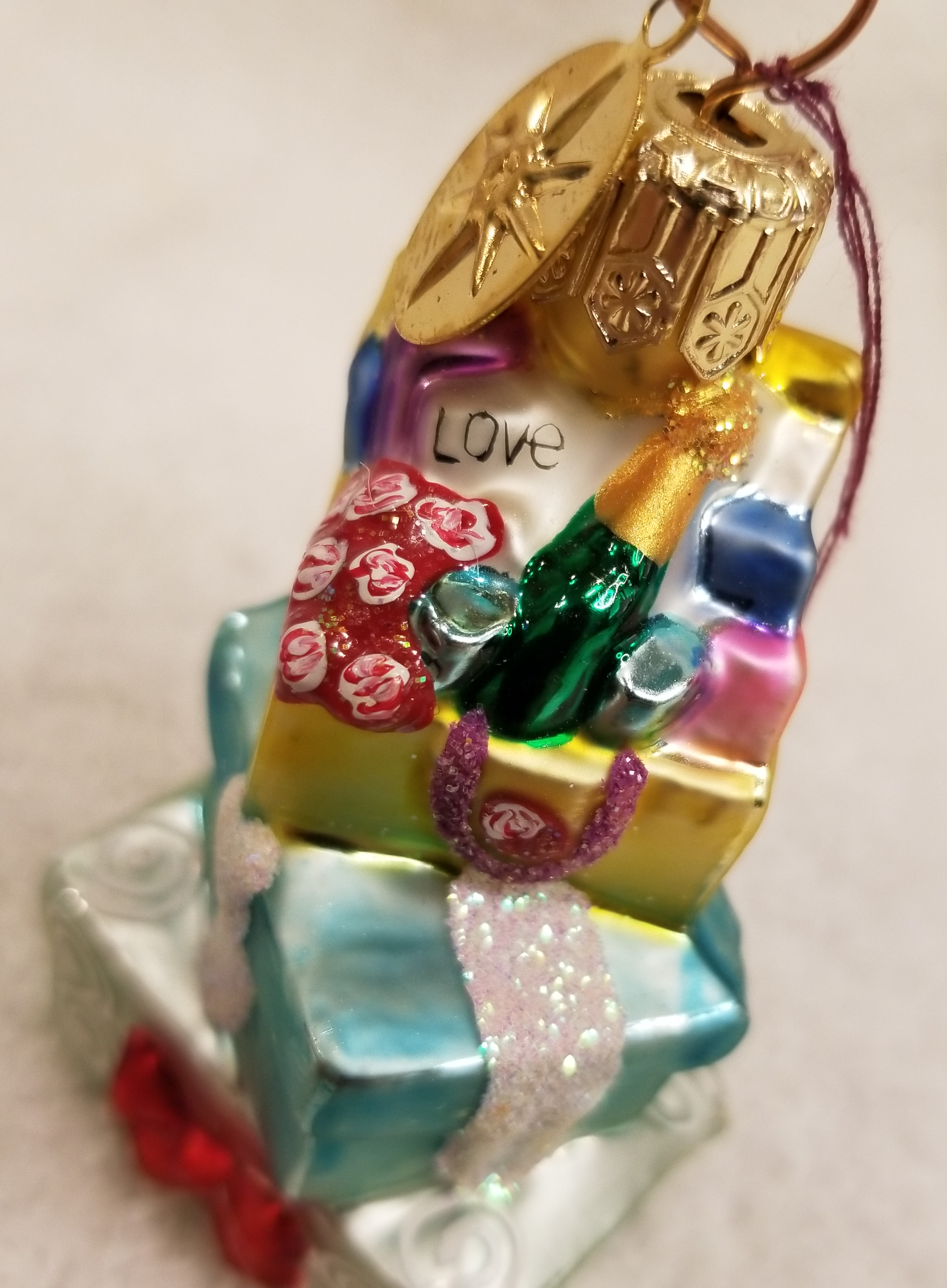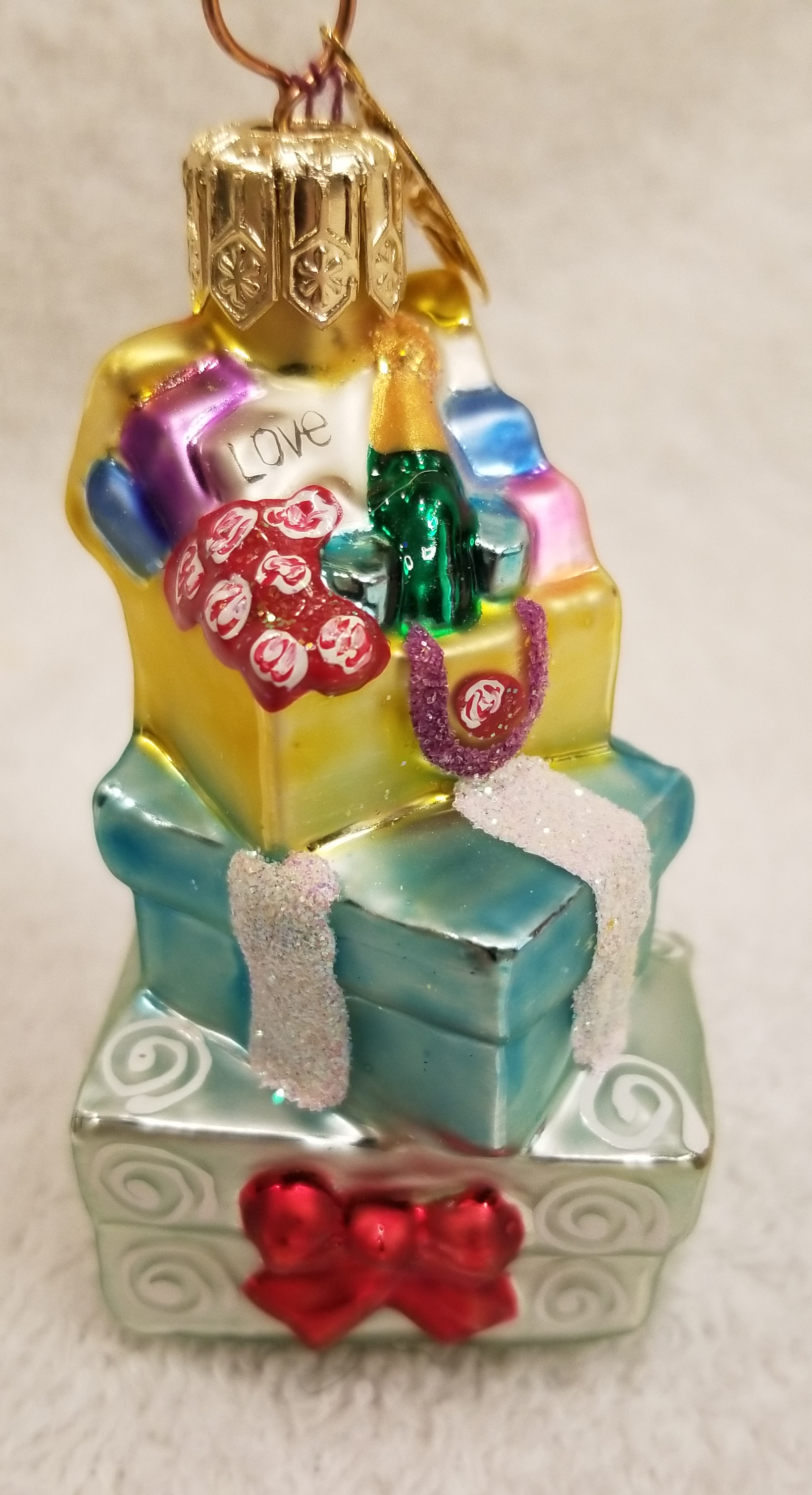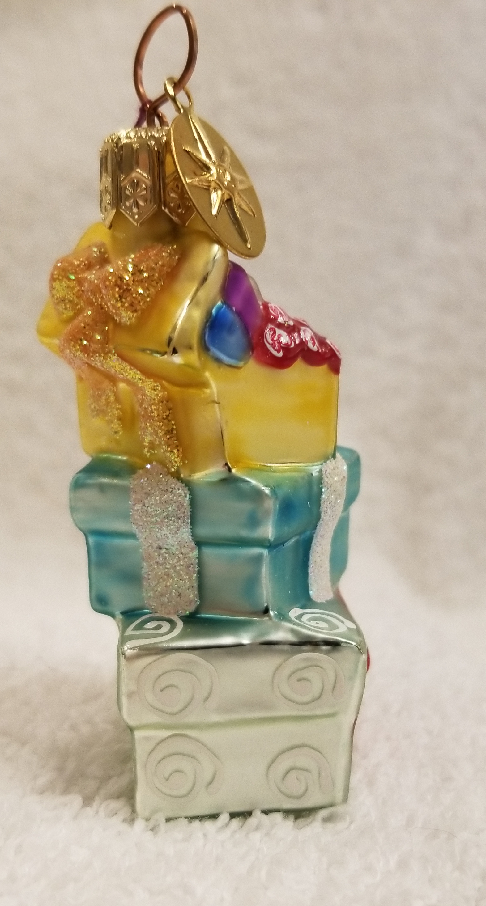 | Today I'm listing a beautiful pastel-colored stack of gifts. This is Just for You gem. Radko number 99-936-0. There's even a bottle of champagne on top! I hope the pictures do it justice. The original metal charm is still attached and the paper tag is available. I'm asking only $25 plus shipping via Pirate Ship however you prefer. |