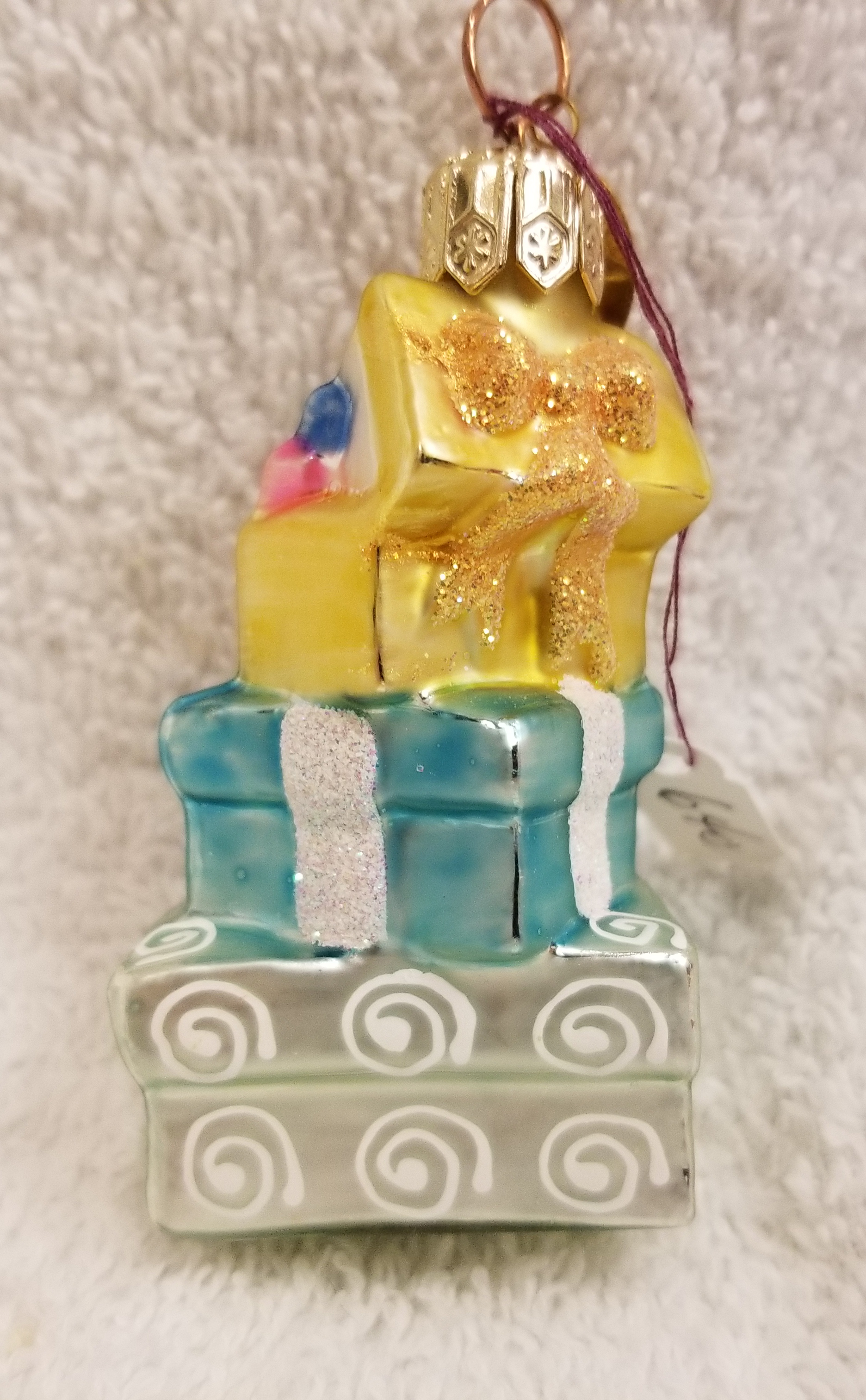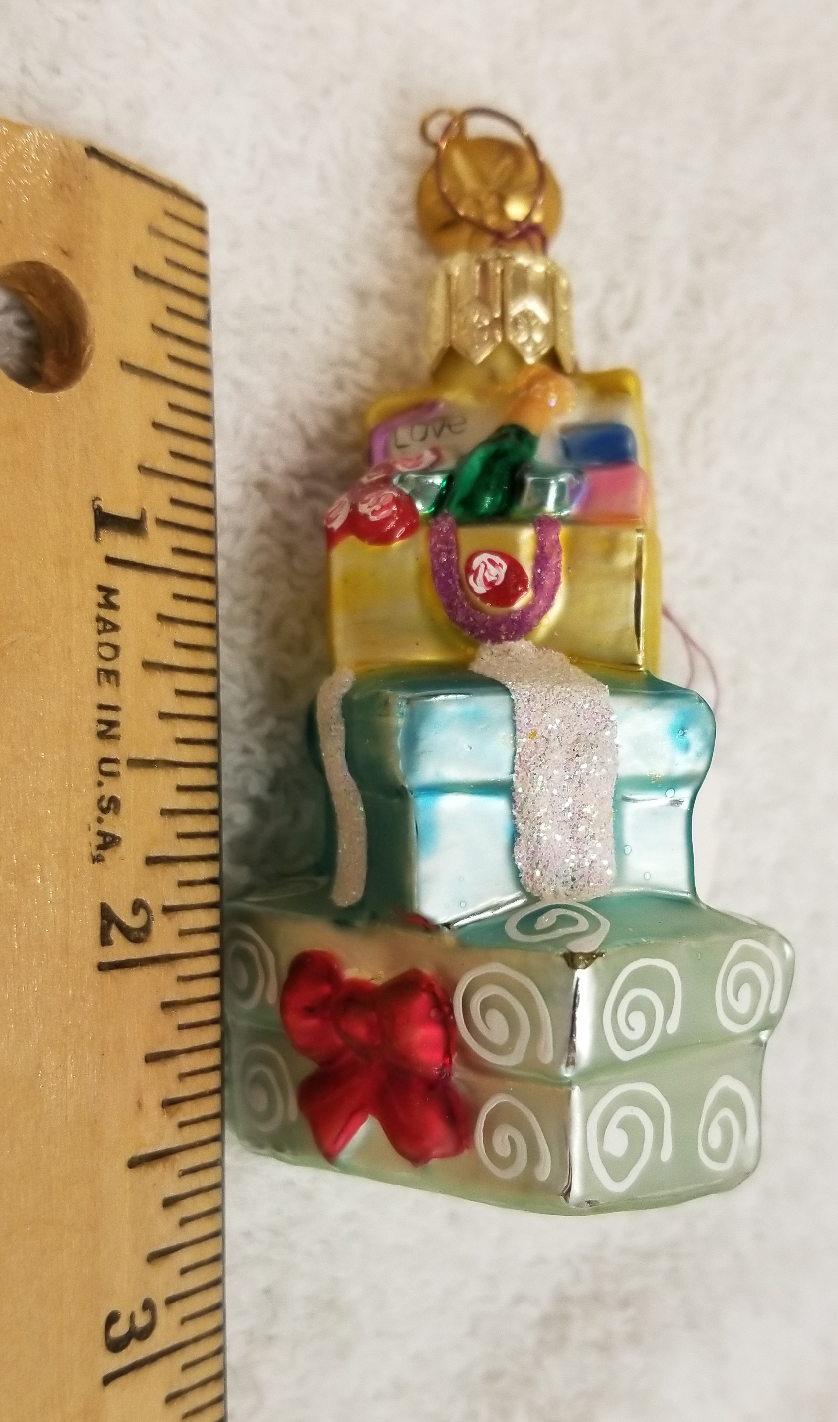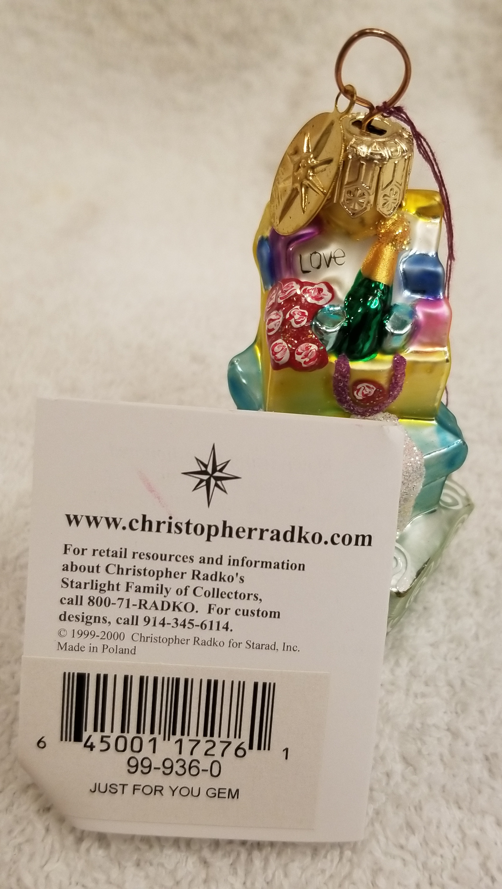| Today I'm listing a beautiful pastel-colored stack of gifts. This is Just for You gem. Radko number 99-936-0. There's even a bottle of champagne on top! I hope the pictures do it justice. The original metal charm is still attached and the paper tag is available. I'm asking only $25 plus shipping via Pirate Ship however you prefer. |