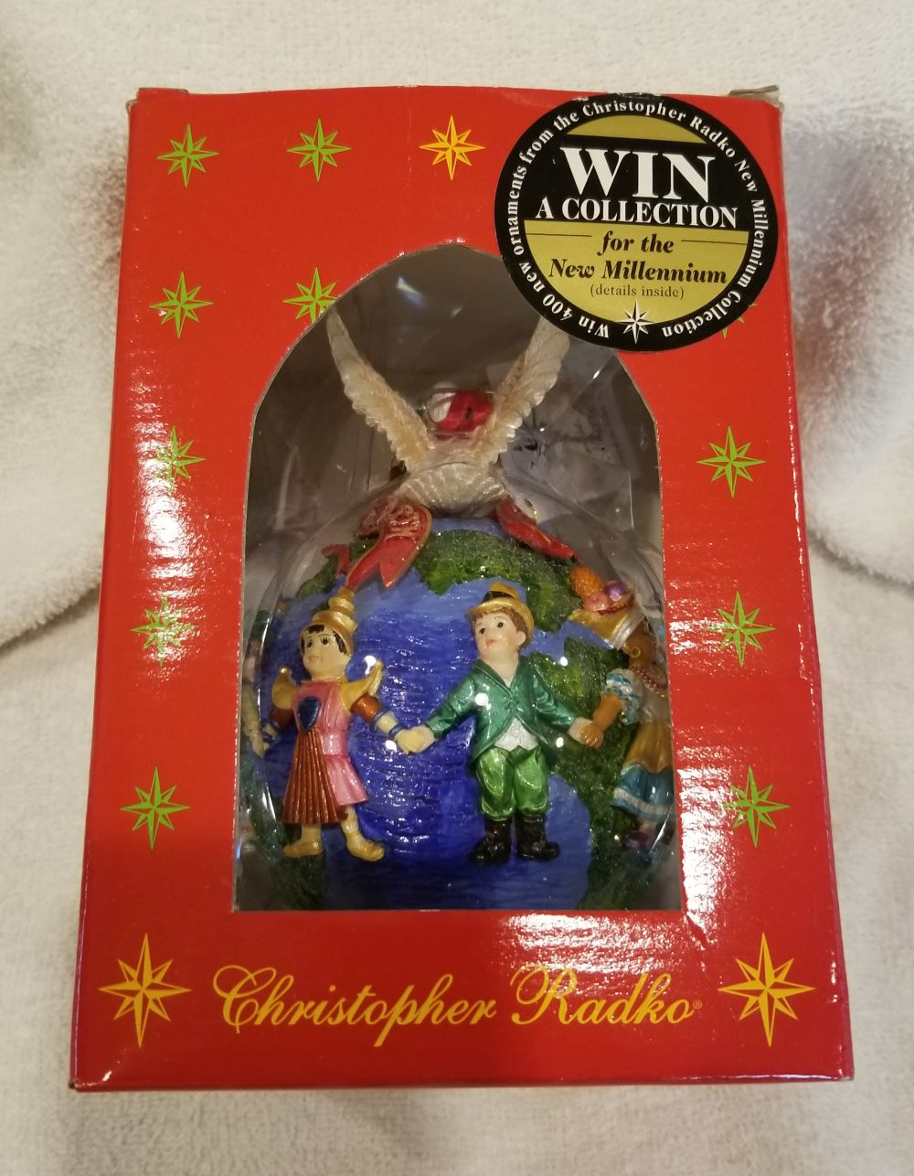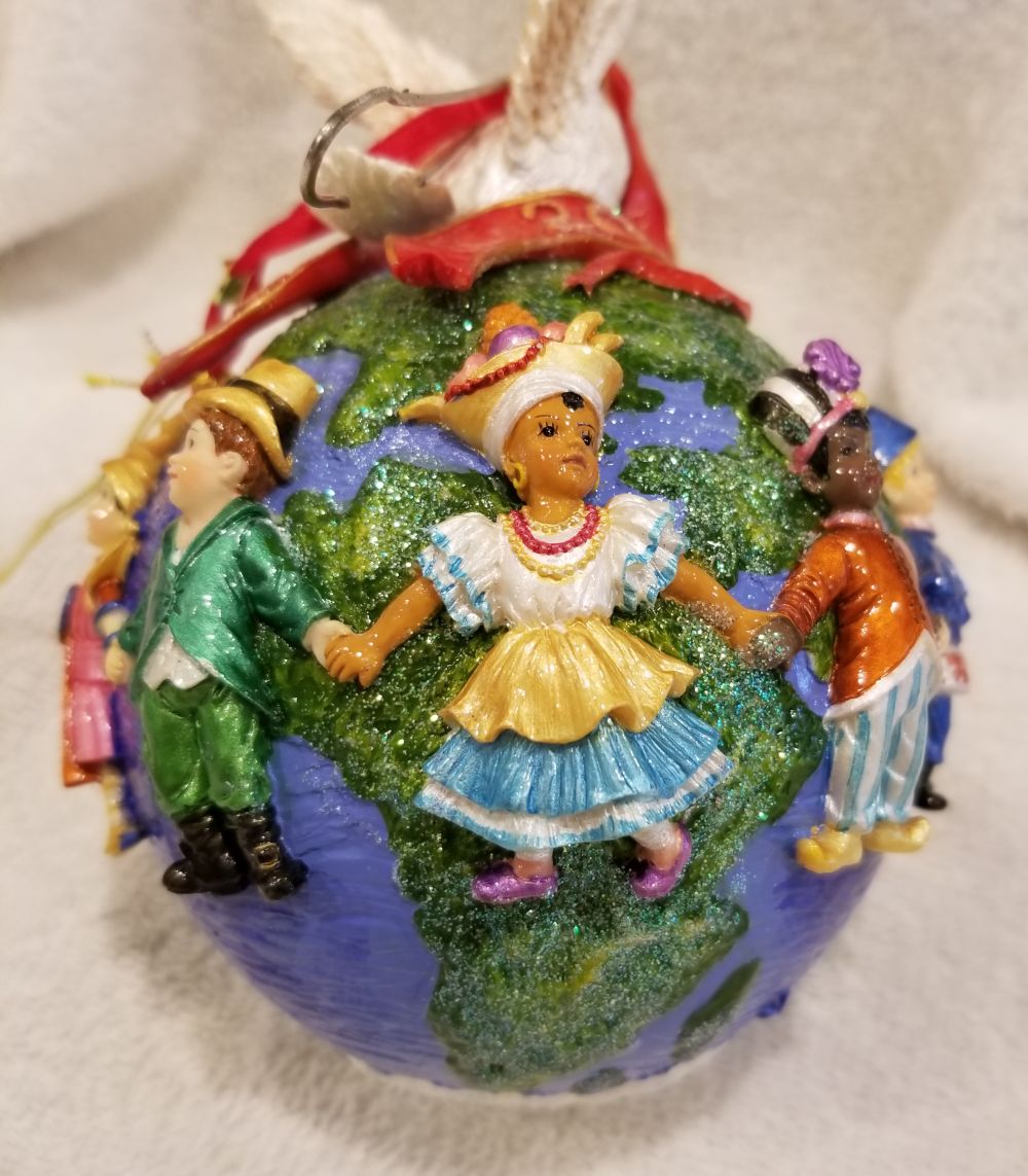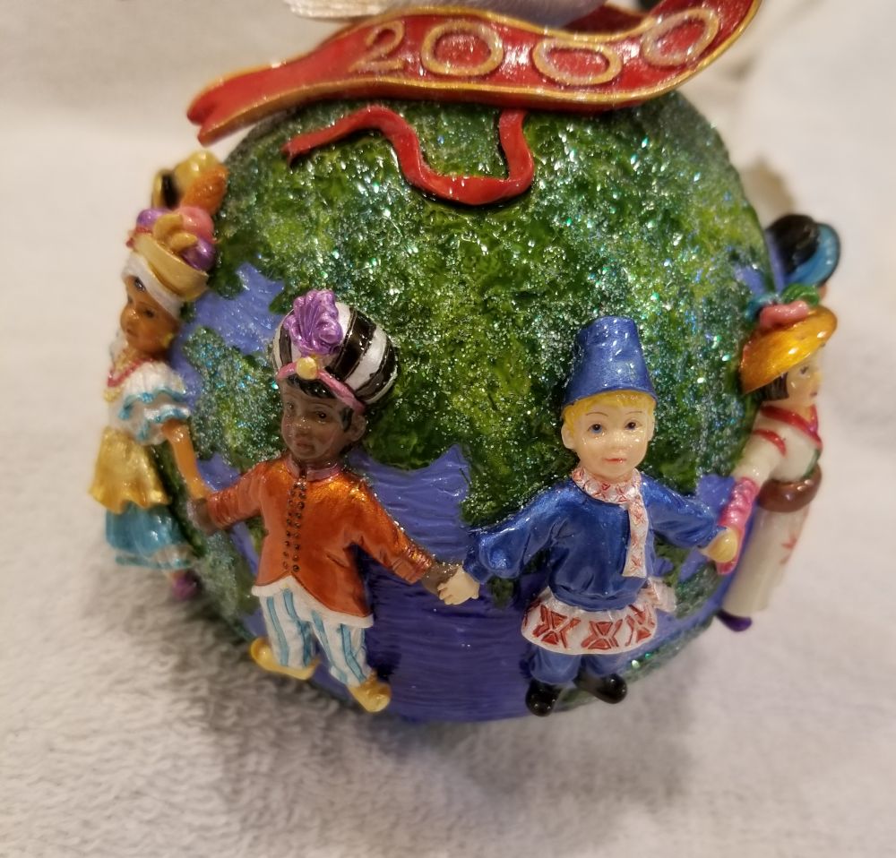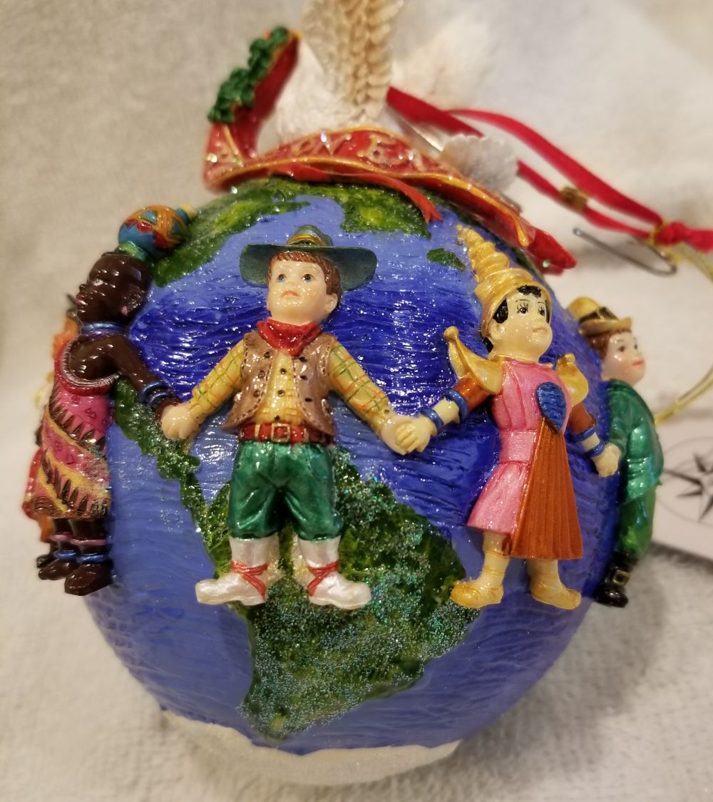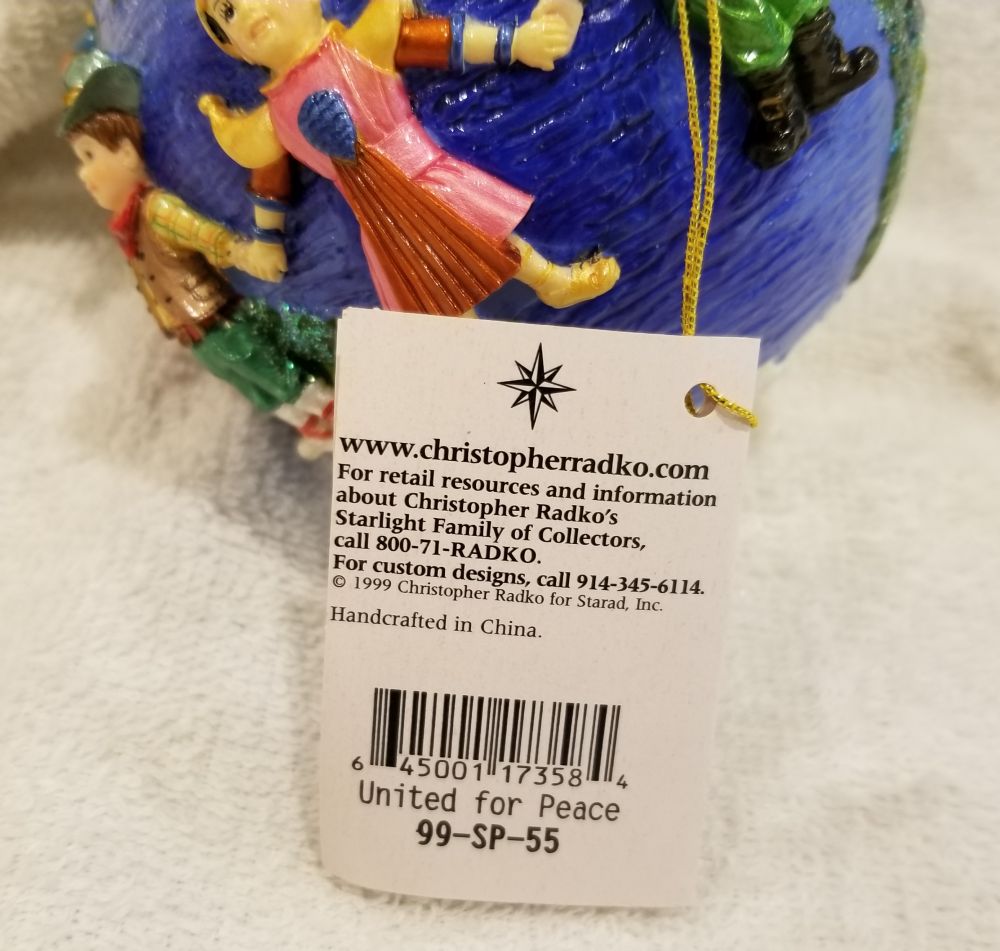 | Today I'm listing another special one! This is United for Peace, Radko number 99-SP-55. Dated 2000, this irnament features children of different nationalities holding hands circling the earth with a peace dove on top. This one does come in the Radko window box pictured. The ornament stands nearly 6" tall and 4" wide. The original paper tag is available. I'm asking $30 plus shipping via Pirate Ship however you prefer. Please ask if there are any questions and thanks for taking a look! I'm also finally able to start sharing my updated listing of all my Radko ornaments that are available. If you'd like to take a look, please visit https://randysornaments.com/radko.htm . Thanks! |